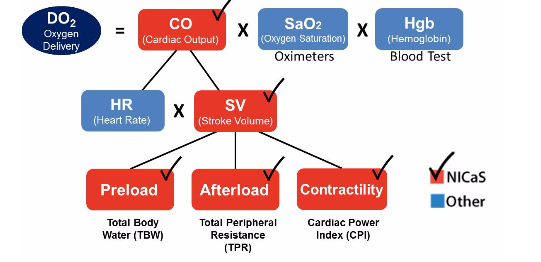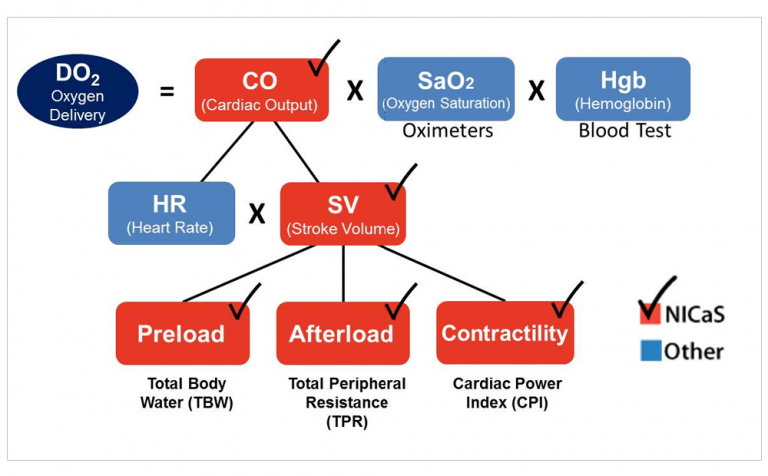 From a clinical standpoint, NICaS is able to provide accurate (highly correlates with pulmonary artery catheter), consistent and real-time date of one’s cardiovascular physiology. This would facilitate the ability to improve our understanding of one’s cardiovascular state, provide a clue as to what is causing the current state and Heart Failure, facilitate titration of medication to more optimal levels and provide a mean of assessing one’s response to medication adjustments. When coupled with physician or nurse practitioner with a strong understanding of basic cardiovascular physiology, NICaS has the potential to revolutionize the management of both chronical and acute heart failure and to, more importantly, improve outcomes for patients with this dreaded syndrome. See Figure 1 for the physiology of oxygen delivery as can provided by NICaS