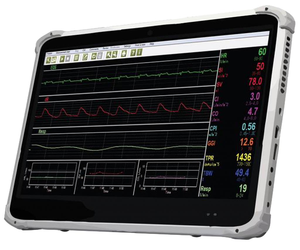Impedance Cardiography (ICG) is a noninvasive technology for measuring total electrical conductivity of the human body and its changes over time to process continuously a number of hemodynamic parameters such as Stroke Volume (SV), Heart Rate (HR), Cardiac Output (CO), Body water, Total peripheral Resistance (TPR) and Cardiac Power (CP).