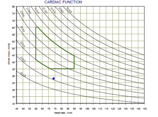 The Cardiac Function graph consists of the Heart Rate (HR) in the X-axis, the Stroke Volume Index (SI) in the y-axis and lines of the Cardiac Output Index (CI). In addition, the normal range is marked by green lines. Patient’s cardiac function represents by a black dot.