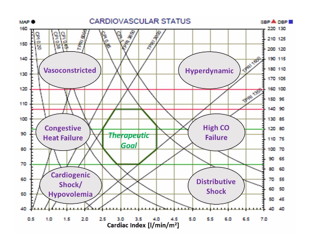 The 2 graphs (Cardiovascular Status and Cardiac Function) provide a very clear understanding of patient’s pathophysiology by the location of the black dots. Various areas represent different syndromes, as can be seen on the graph below, while the respond to treatment or trend over time is very clear.