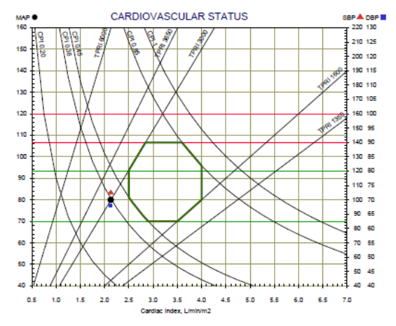 The Cardiovascular status graph consists of the Cardiac Output Index (CI) as the X-axis, the Blood pressure as the Y-axis and lines of Total Peripheral Resistance Index (TPRI) and Cardiac Power Index (CPI). In addition, the normal range is marked by green lines. Patient’s cardiovascular status represents by a black dot. A red triangle and a blue square represent the systolic and diastolic blood pressure respectively.