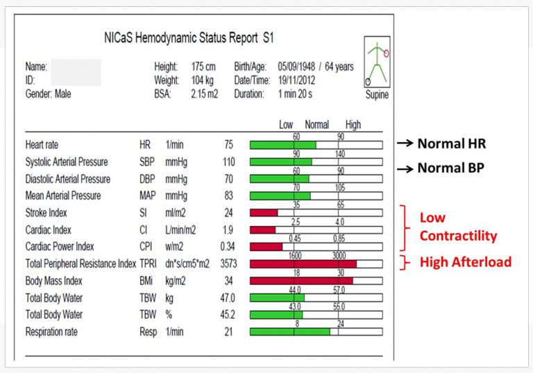 A heart failure patient comes to his cardiologists for a routine checkup. NICaS inspection reveals low contractility and high afterload. Total Body Water was normal. NICaS identified impending heart failure just before decompensation. See Figure 1 for patient’s first NICaS inspection report.