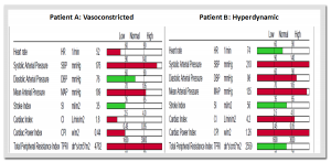 NICaS inspection reveal that Patient A is Vasoconstricted (low Cardiac Index and high Peripheral Resistance) and Patient B in Hyperdynamic with high Cardiac Index and normal Peripheral Resistance. See Figure 3 for NICaS measurement report of both patients.